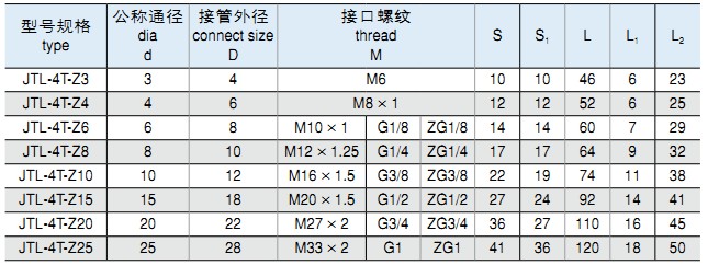 標(biāo)記示例:①:卡套式三通終端管接頭 公稱通徑 Ø6MM JT-3T-Z6 M10×1