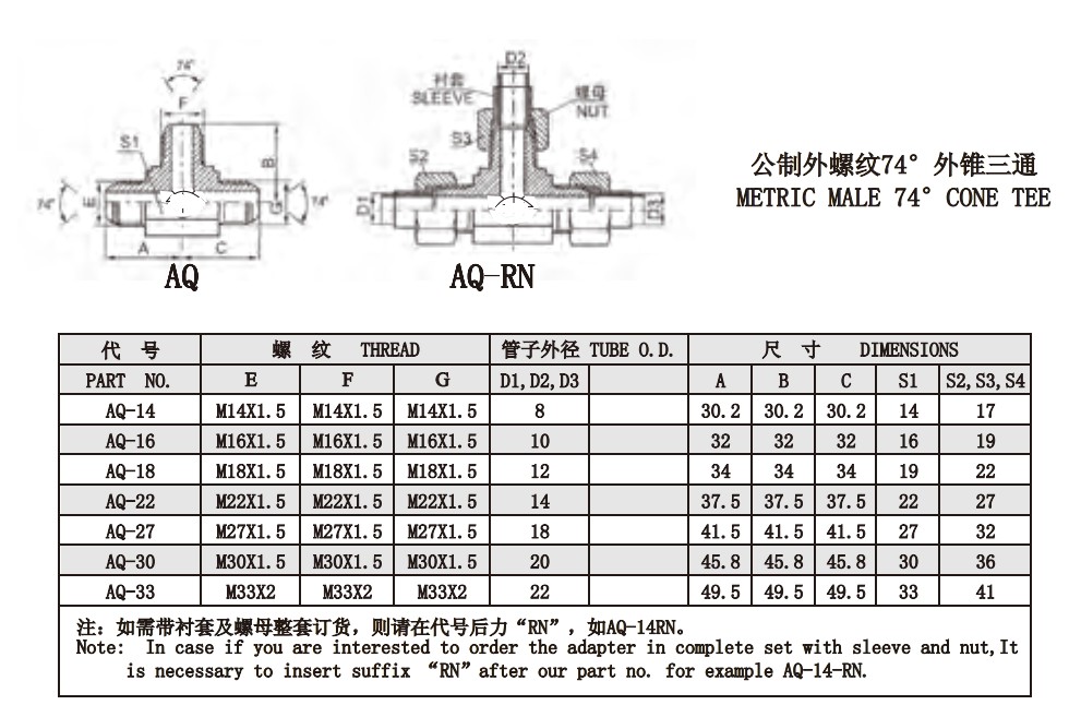 AQ AQ-RN 公制外螺紋74°外錐三通